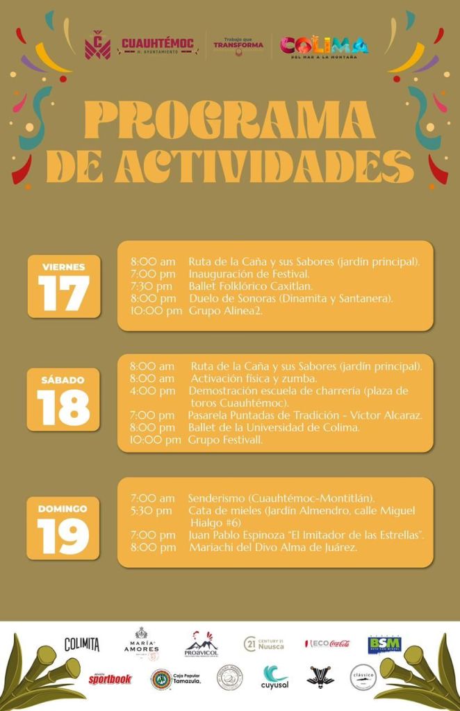 El programa iniciará el viernes 17 de abril con la Ruta de la Caña y sus Sabores en el jardín principal, seguida de la inauguración oficial y presentaciones artísticas como el Ballet Folklórico Caxitlán, el espectacular duelo de sonoras con la Dinamita y la Santanera, y el espectáculo musical del grupo Alinea2.