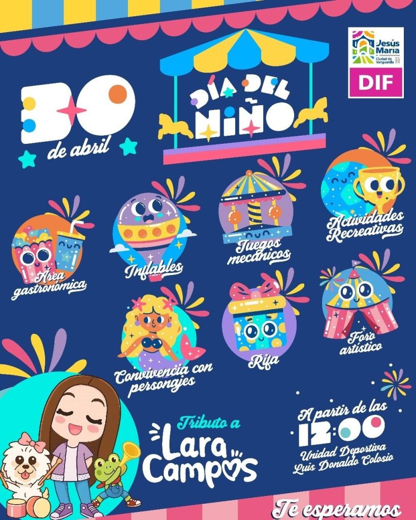 El Gobierno Municipal de Jesús María, a través del Sistema DIF Municipal, invita a todas las niñas y niños del municipio a celebrar el Día del Niño este próximo 30 de abril, en un evento especial y gratuito que se llevará a cabo en la Unidad Deportiva Luis Donaldo Colosio.